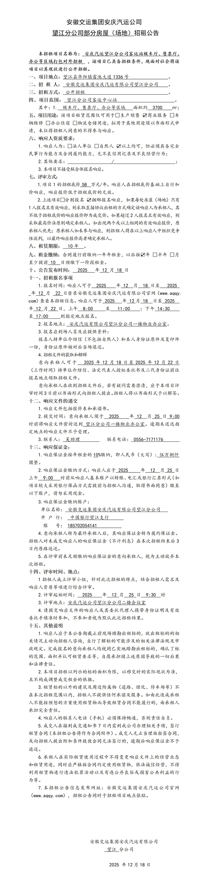 望江分公司部分房屋(場(chǎng)地)招租公告