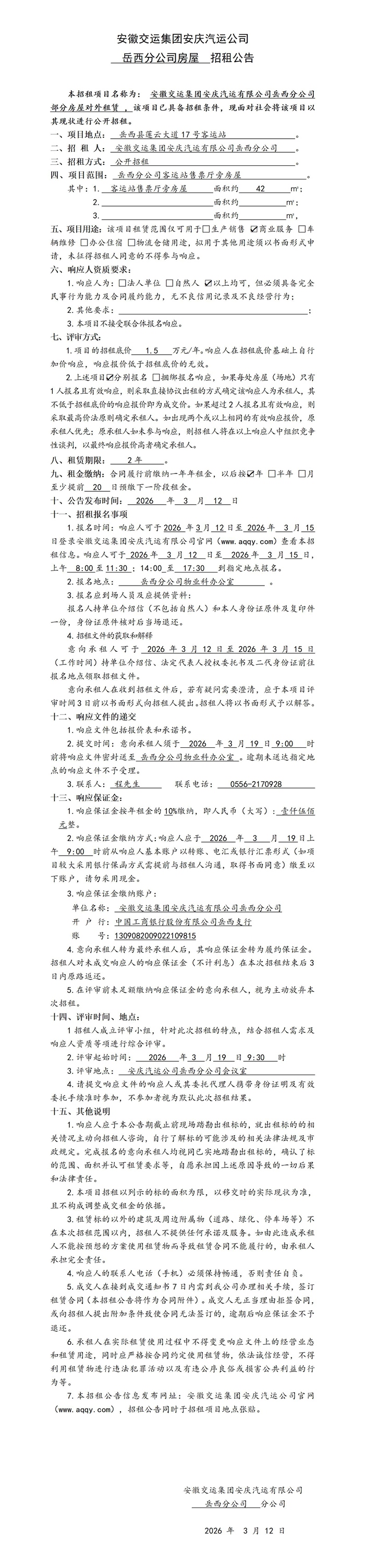岳西分公司部分房屋對(duì)外租賃公告