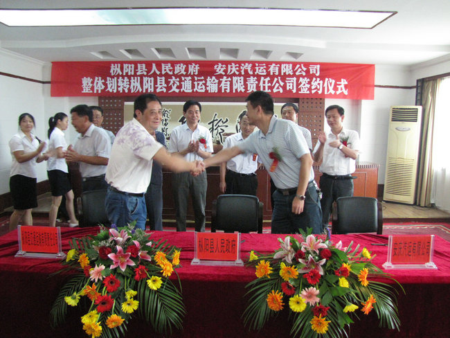 2011年9月1日,樅陽縣人民政府、安徽省交通集團安慶汽運有限公司整體劃轉(zhuǎn)樅陽縣交通運輸有限責(zé)任公司簽約儀式在樅陽迎賓館會議大廳內(nèi)隆重舉行。樅陽縣縣長何謙、副縣長胡海峰,省交通集團汽車運輸有限公司副總經(jīng)理方詩喬,安慶汽運有限公司董事長張進、黨委書記徐軍、副總經(jīng)理王中明、彭宏、紀(jì)委書記郭峰,樅陽縣交通運輸有限責(zé)任公司經(jīng)理童子健出席了簽約儀式。