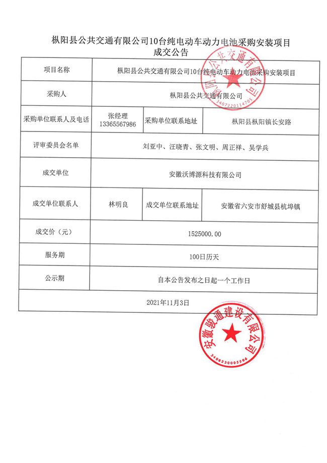 樅陽(yáng)公共交通有限公司10臺(tái)純電動(dòng)車電池采購(gòu)安裝項(xiàng)目成交公告