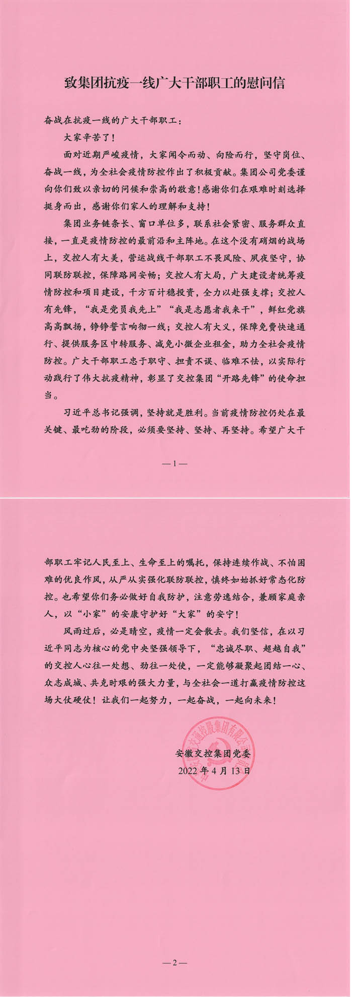 致集團(tuán)抗疫一線廣大干部職工的慰問(wèn)信