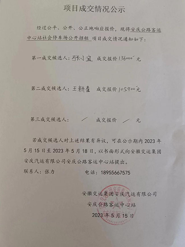 安慶中心站社會(huì)停車場(chǎng)公開(kāi)招租結(jié)果公示